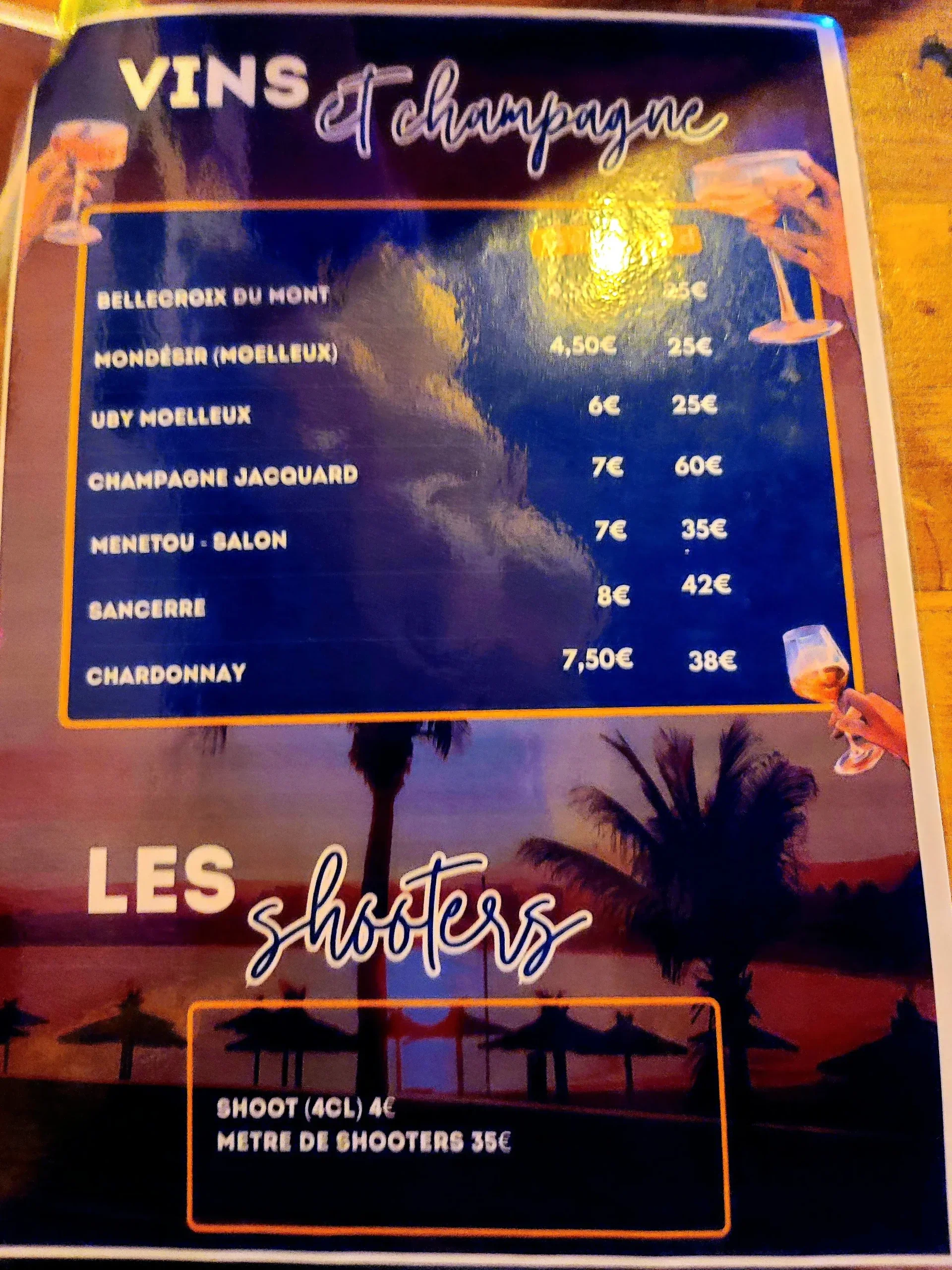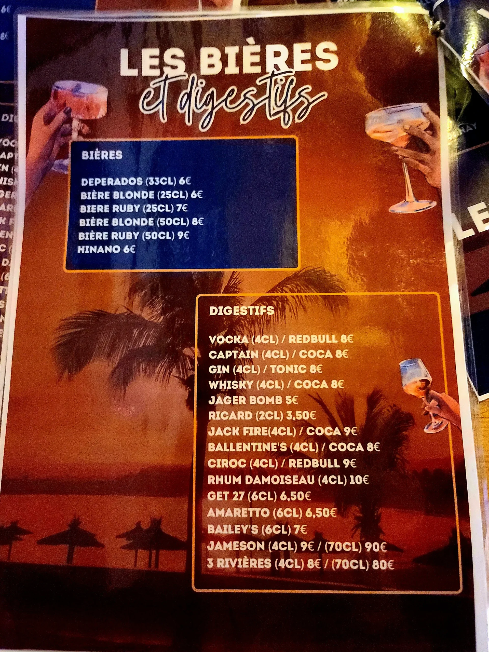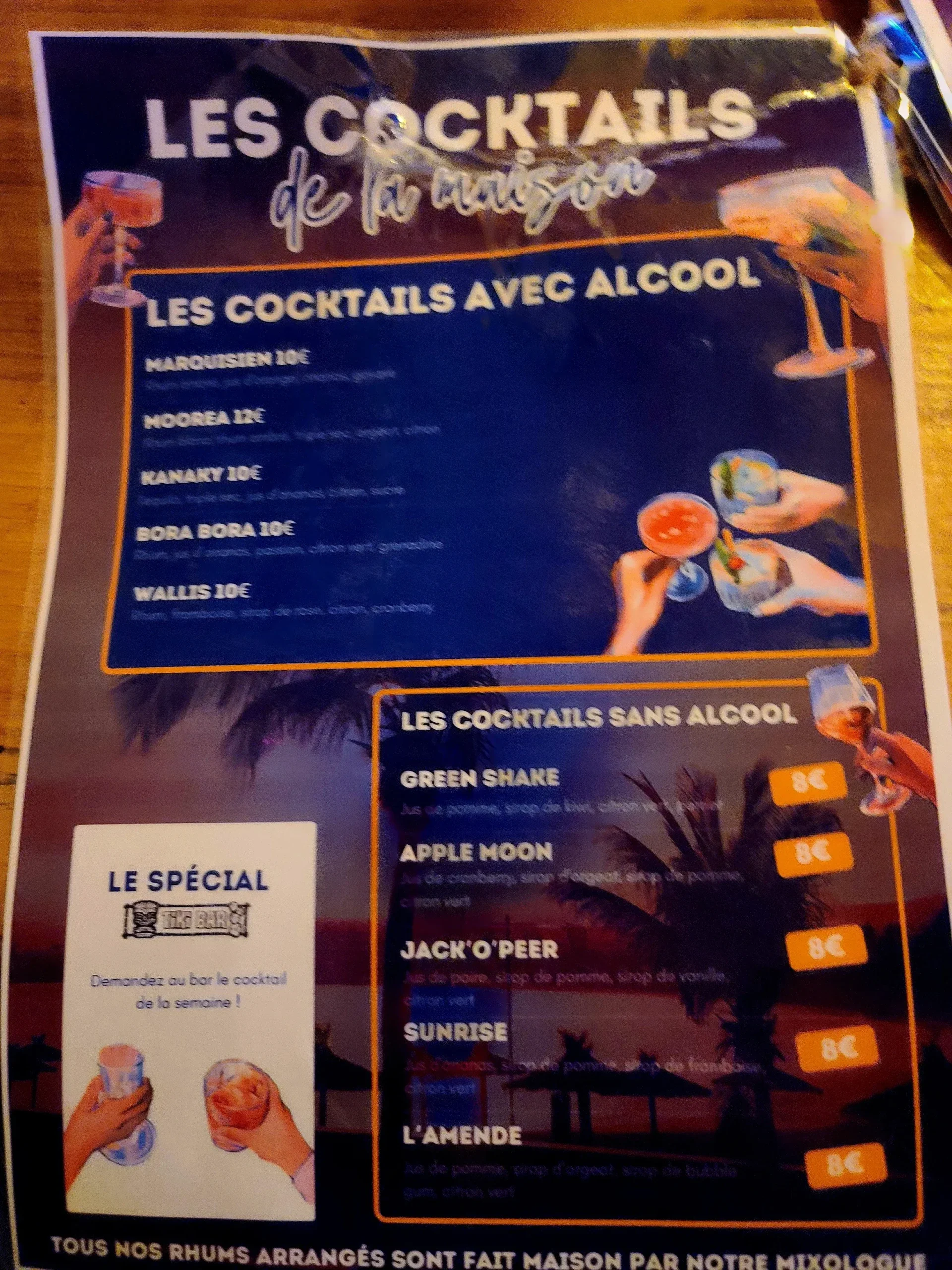 Le bar offre également une touche unique avec ses rhums arrangés faits maison, ainsi que le fameux "Spéciale" où il vous suffit de demander au bar pour découvrir le cocktail de la semaine. L’offre du Tiki Bar ne se limite pas qu’aux cocktails : vous trouverez aussi une sélection de bières, de digestifs, de shooters, ainsi que des vins et des champagnes pour compléter votre expérience.
