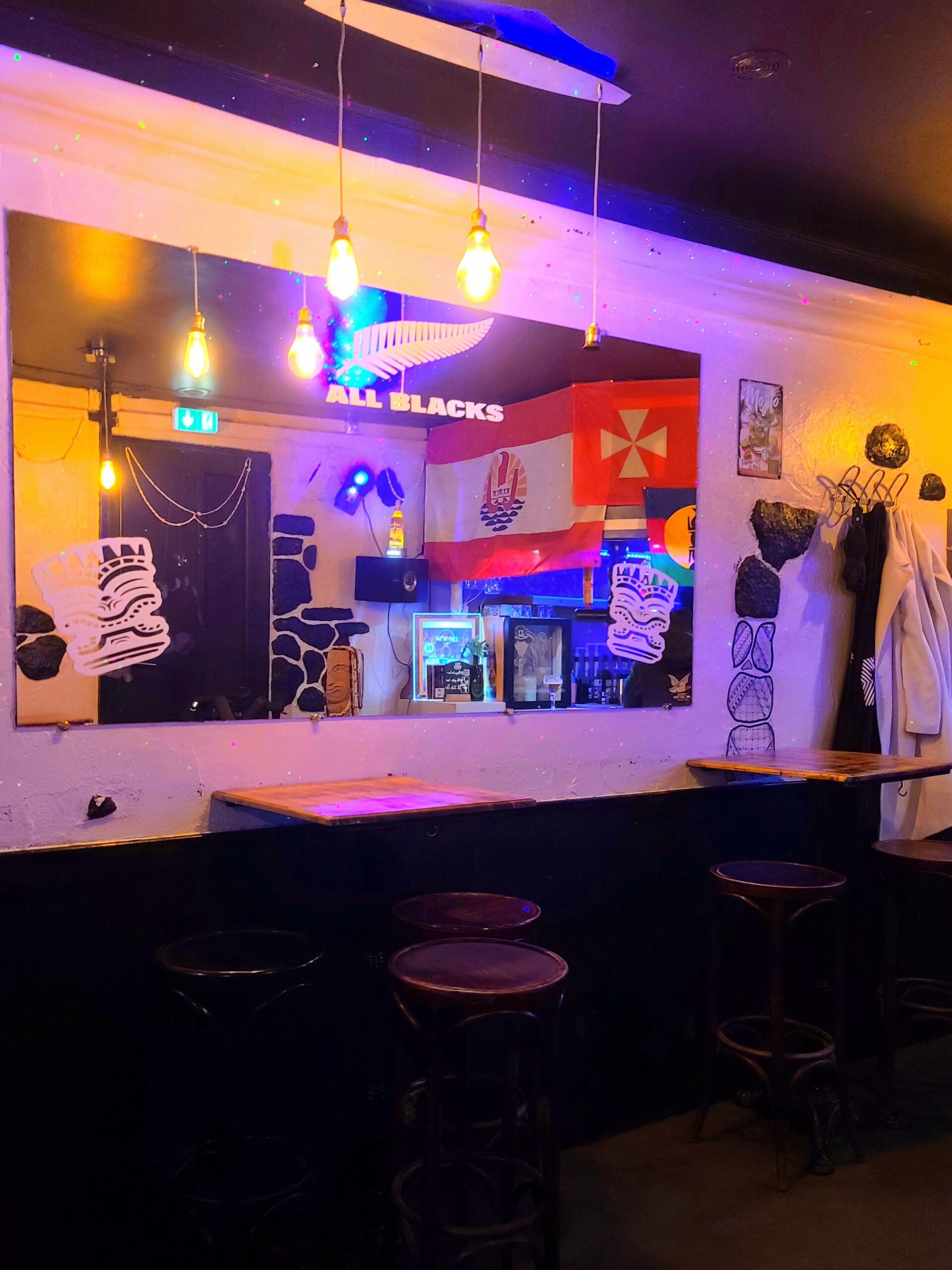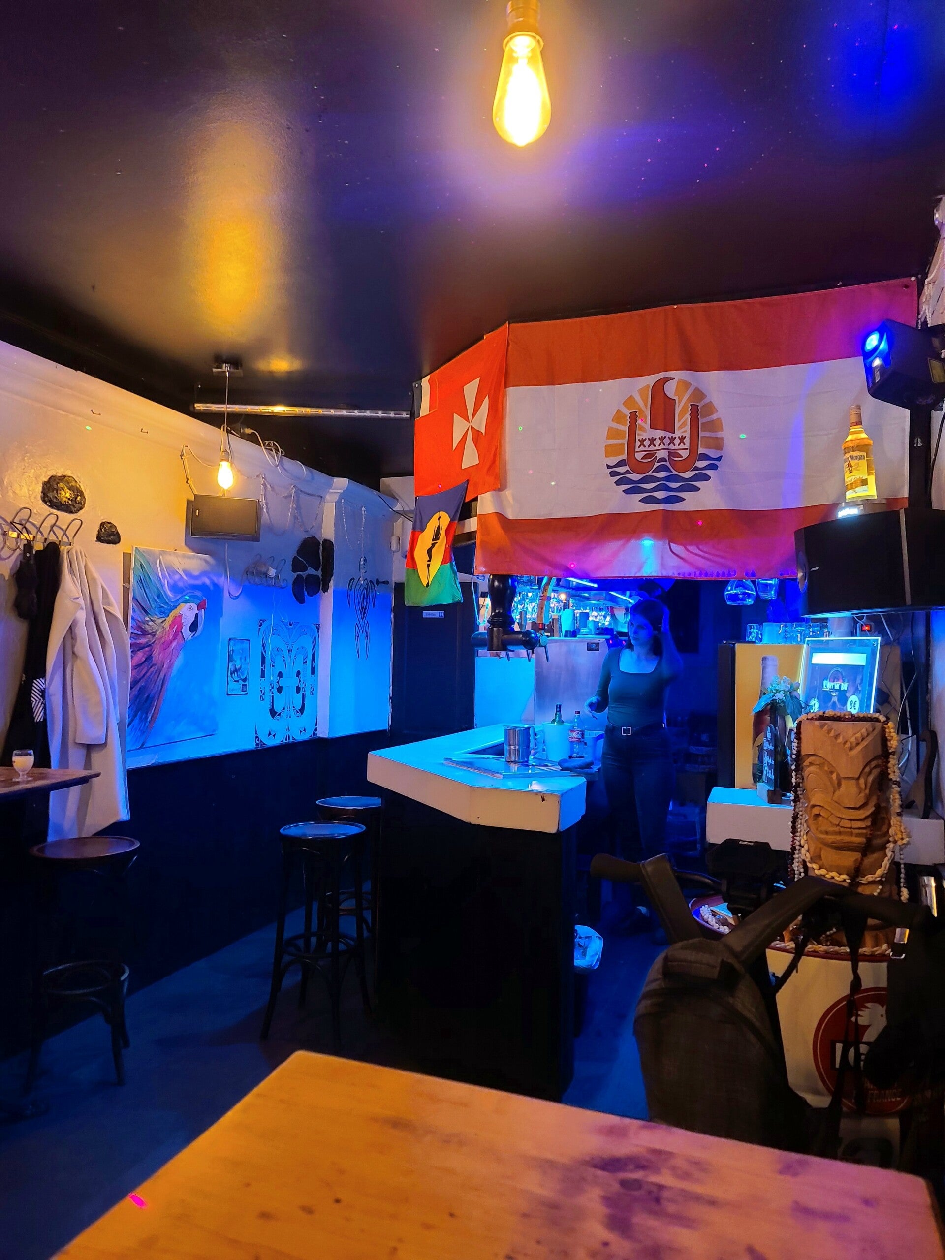 Le service est un autre point fort du bar : la serveuse était non seulement sympathique, mais aussi rapide et professionnelle, contribuant ainsi à une atmosphère agréable et conviviale. Côté ambiance, le décor fidèle au thème tiki crée une atmosphère chaleureuse et détendue. La musique, bien choisie, complète parfaitement cette ambiance festive et tropicale.