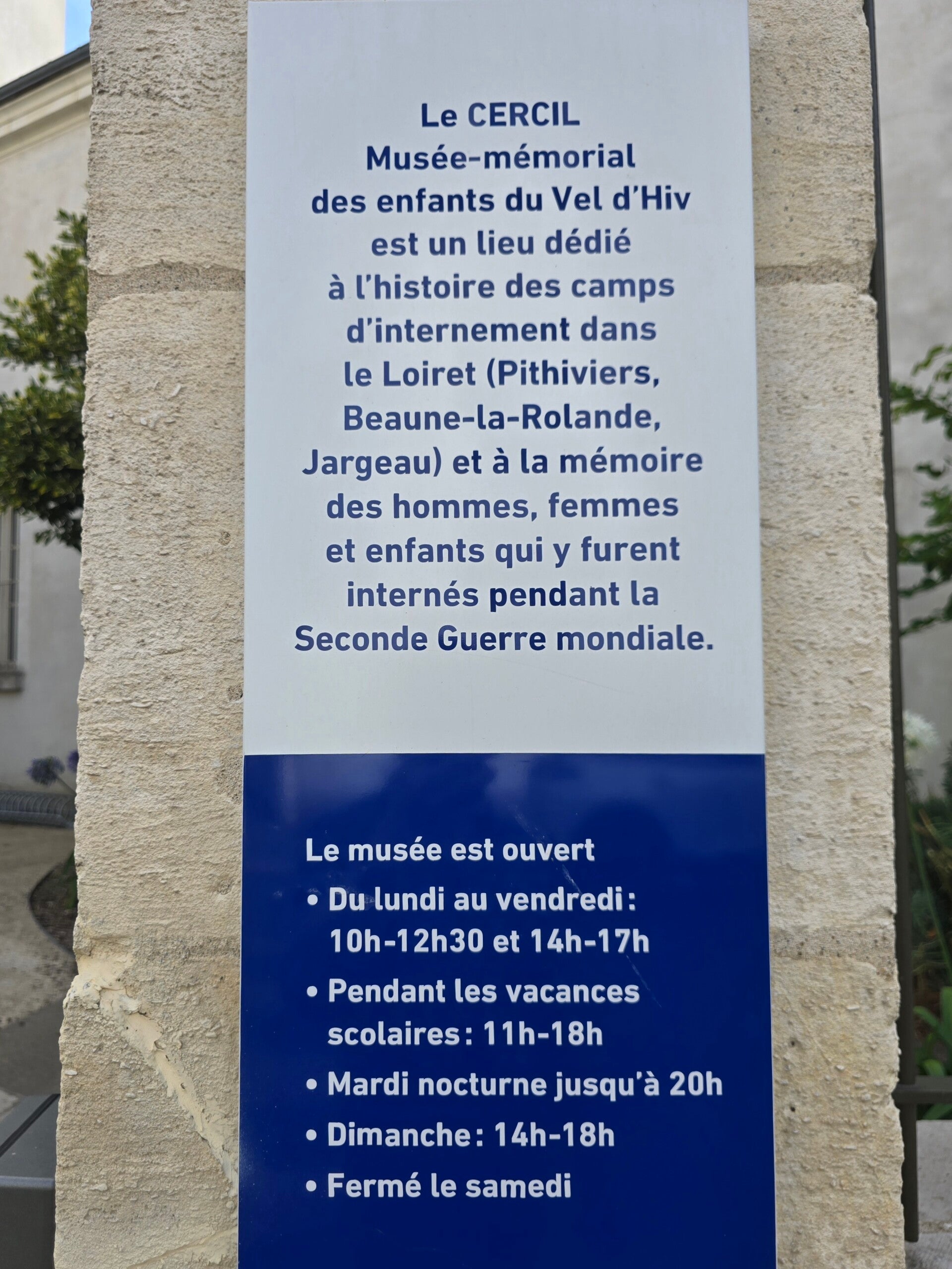 Au-delà de cette exposition temporaire, le CERCIL reste un lieu de mémoire essentiel. Il retrace l’histoire des camps d’internement du Loiret (Beaune-la-Rolande, Pithiviers, Jargeau), par lesquels ont transité des milliers d’hommes, de femmes et surtout d’enfants juifs, avant leur déportation vers Auschwitz. Un mémorial émouvant est dédié aux enfants du Vel d’Hiv, qui furent enfermés là, dans l’attente d’un destin tragique.