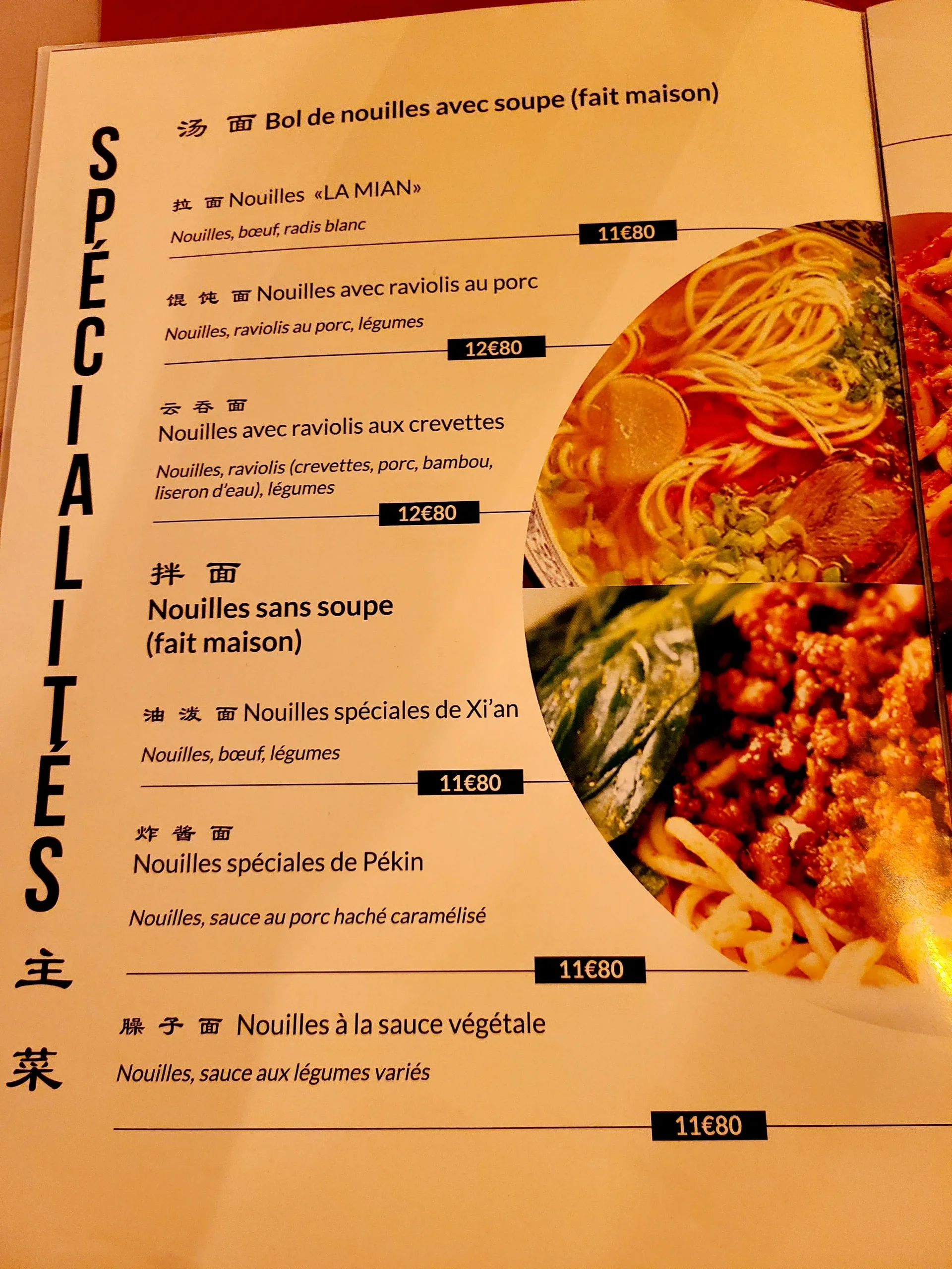 La carte offre un large éventail de mets délicieux, tels que les salades d'algues et de radis marinés en entrée, les raviolis vapeur, les galettes de viande de porc hachée, mais surtout les nouilles tirées maison et à la minute, également connues sous le nom de "Mian", qui donnent leur nom au restaurant. Le chef réalise un véritable spectacle en préparant les nouilles à la main, juste à côté de vous. C'est un véritable enchantement de le voir réaliser ces mouvements magiques pour transformer de la pâte en de délicieuses nouilles de blé. Imaginez, il lui faut pas moins de 100 mouvements pour façonner 500g de nouilles dans un seul bol. C'est une tradition artisanale inspirée des petites échoppes de street-food en Chine.