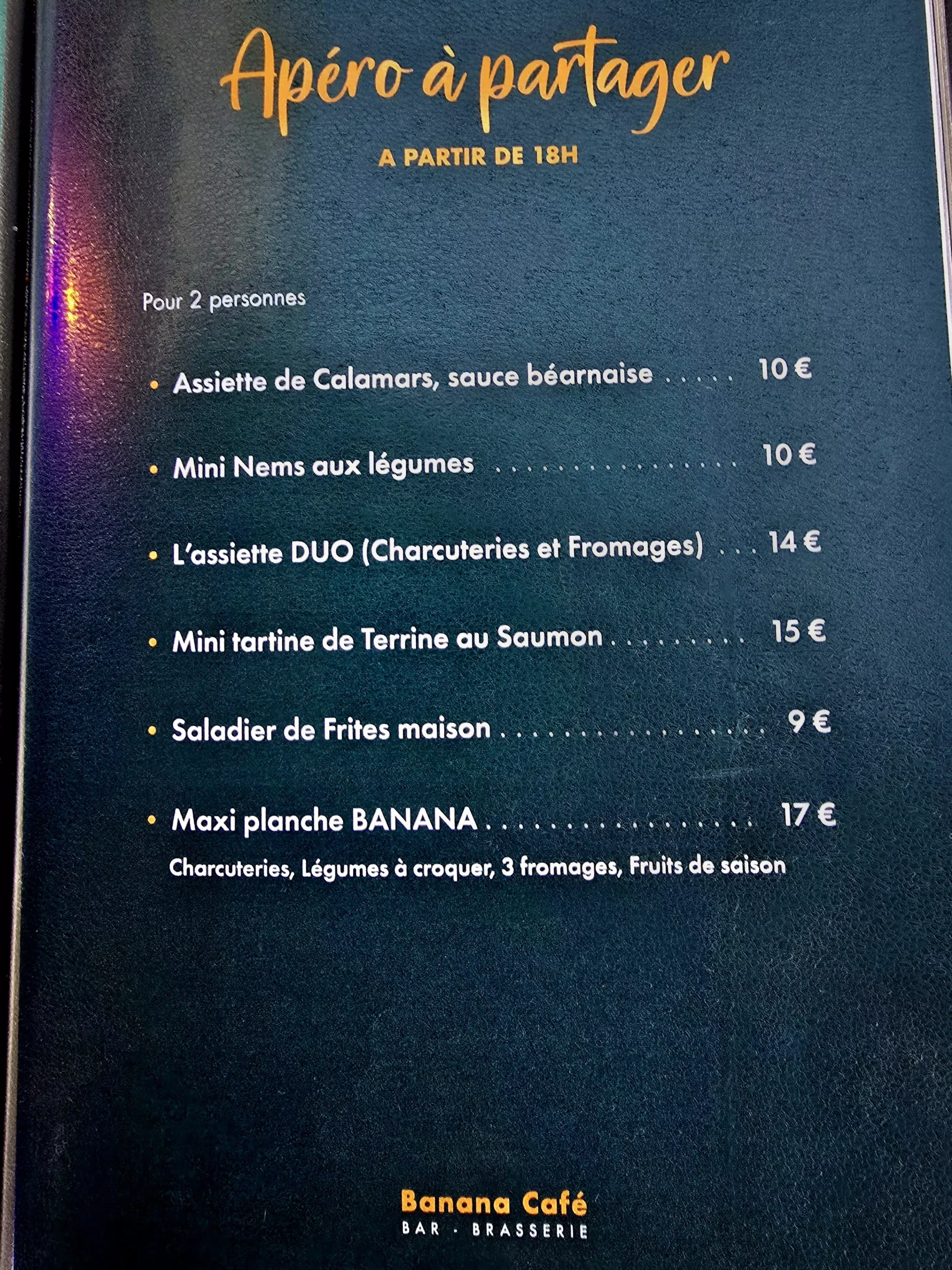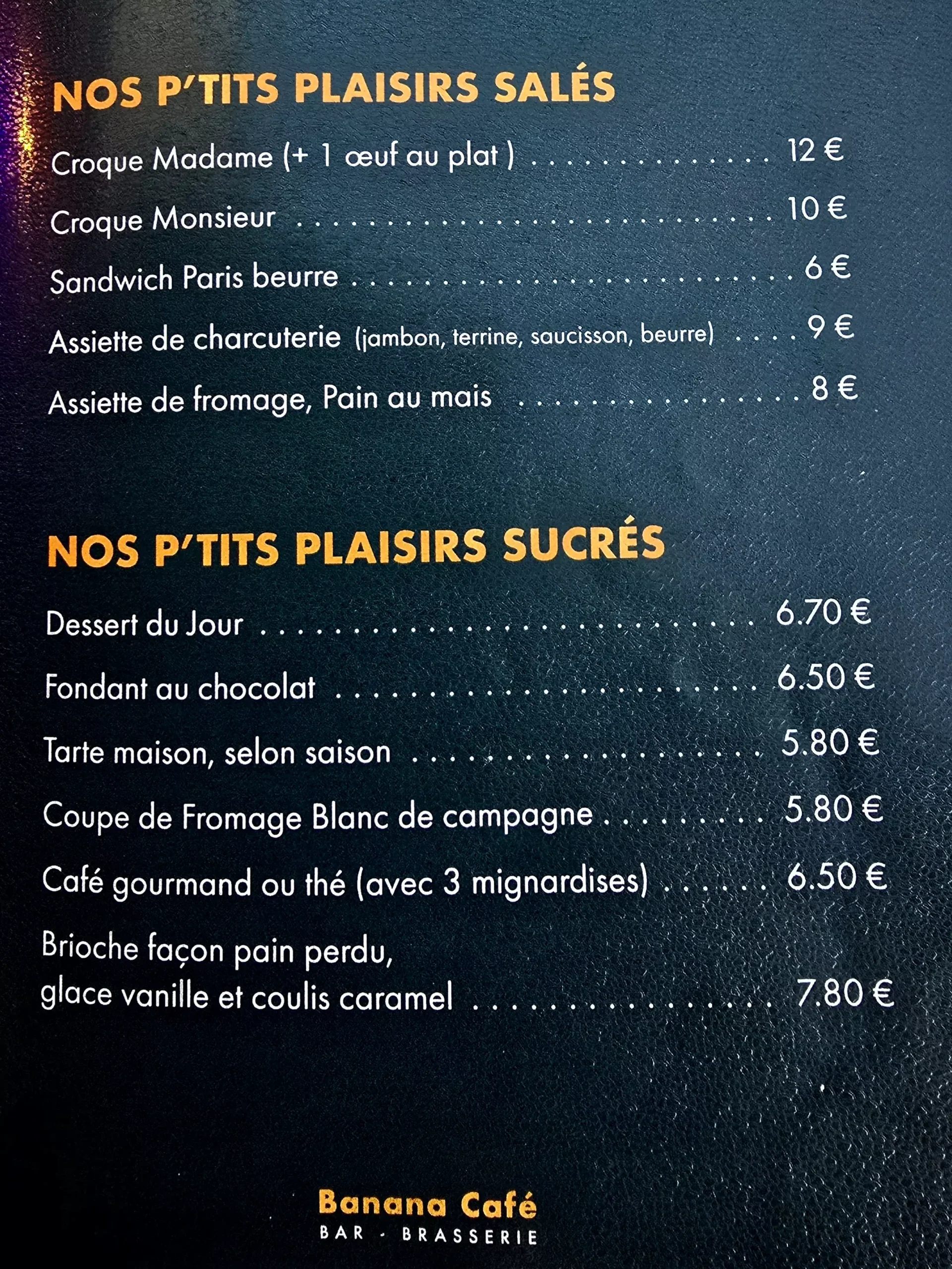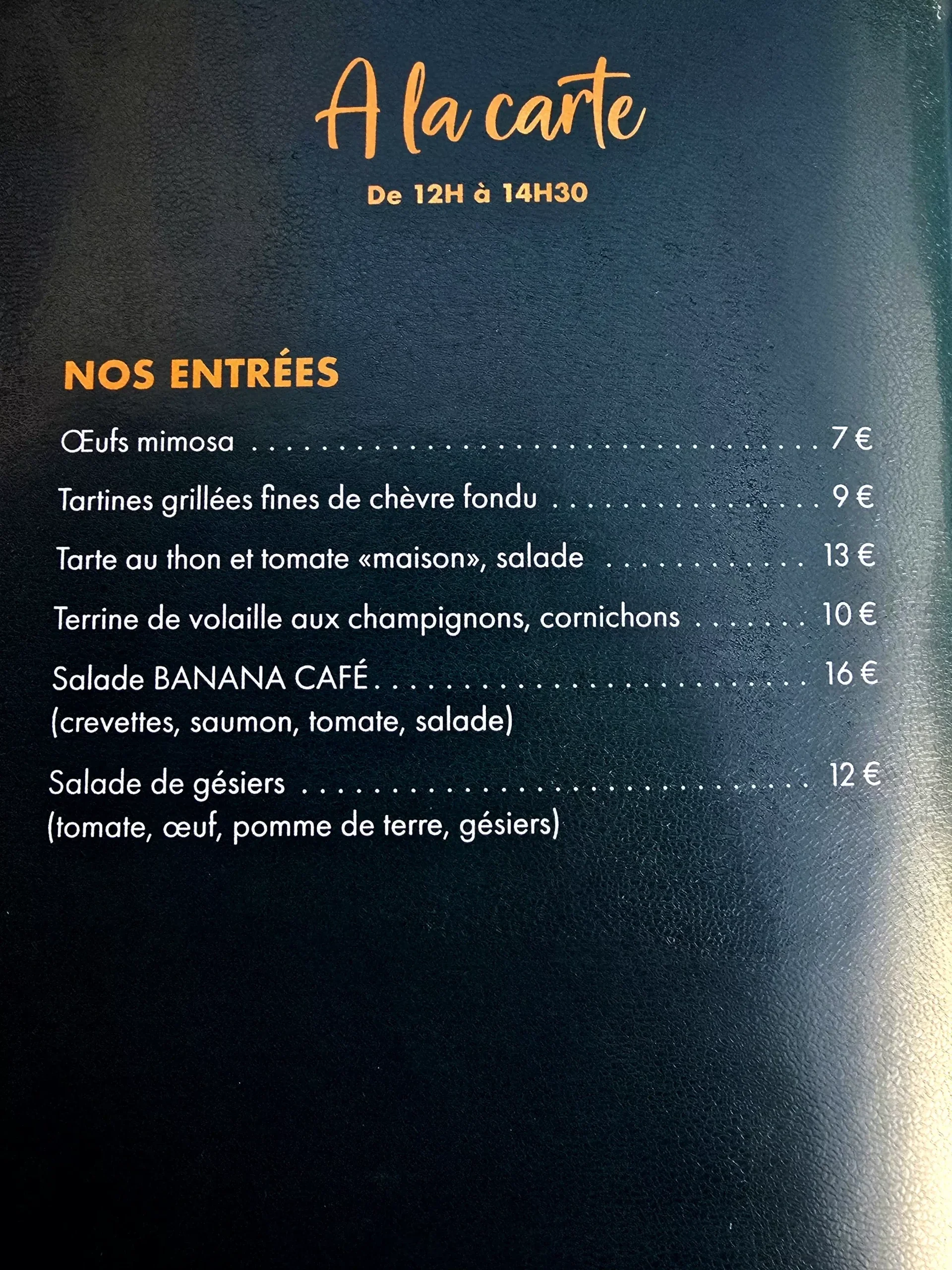 Côté restauration, le midi, le Banana Café propose une carte de brasserie classique mais efficace : tartines grillées au chèvre fondu, terrine de volaille, salades composées… Pour les petites faims, on retrouve croque-monsieur, assiettes de charcuterie ou de fromages. Les plats principaux vont de l’andouillette à la bavette, en passant par le pavé ou le tartare de saumon. Et pour finir sur une note sucrée : tarte maison (selon la saison), café gourmand, crêpes, brioche façon pain perdu ou encore coupes glacées.