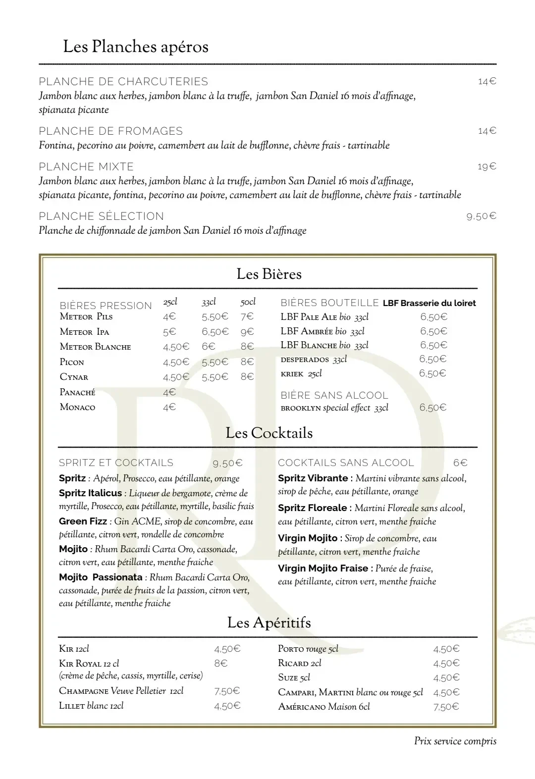 Le menu du Rive Droite est varié et appétissant, offrant une riche palette de saveurs pour satisfaire tous les goûts et toutes les envies culinaires. Dès l'apéritif, les planches généreusement garnies invitent au partage convivial. Les entrées présentent une belle diversité. Les salades et snacks gourmands constituent d'excellentes alternatives pour des repas légers et savoureux. Les plats principaux se distinguent par une offre de viandes, de poissons, de pizzas, des pâtes et risottos. Pour conclure, la carte des desserts propose une sélection irrésistible de douceurs. Consultez la carte complète pour découvrir toutes les options proposées et trouver le plat qui saura combler vos envies. ( Menu en bas de la Page )
